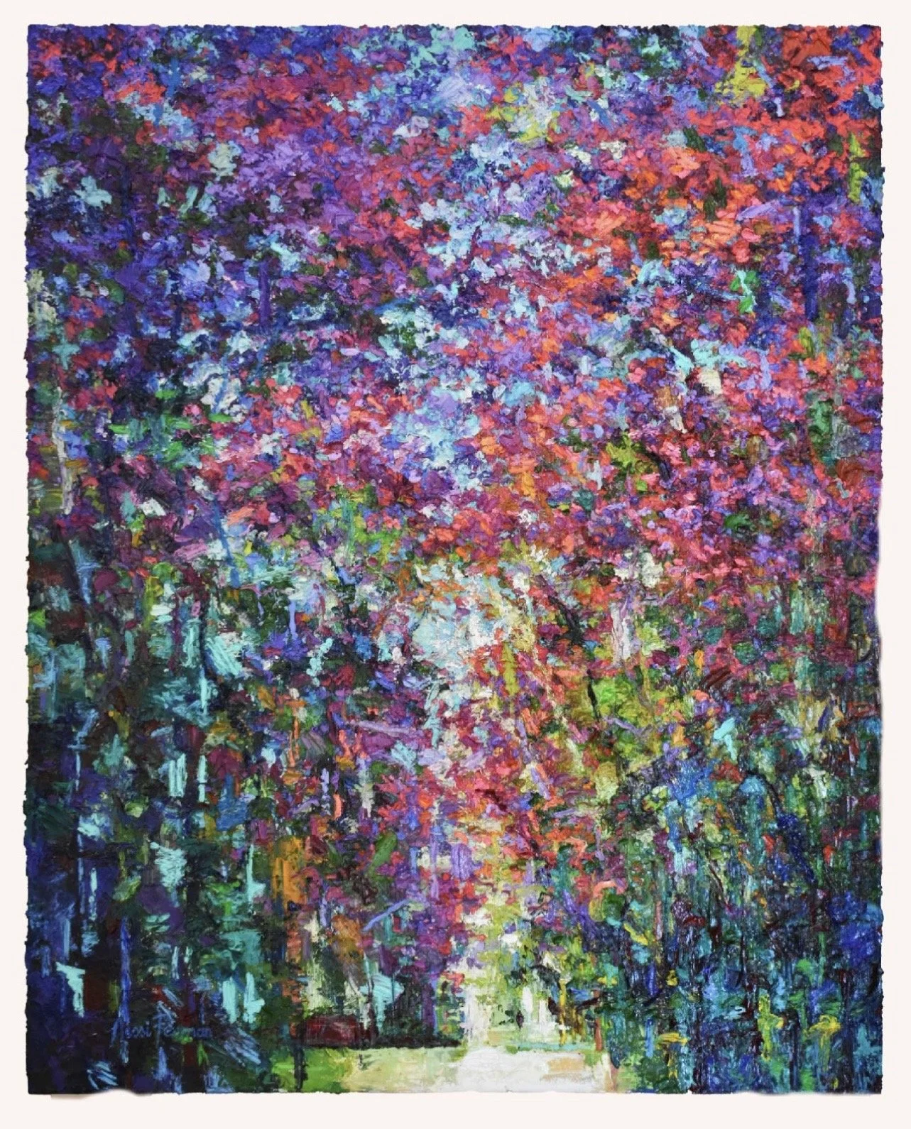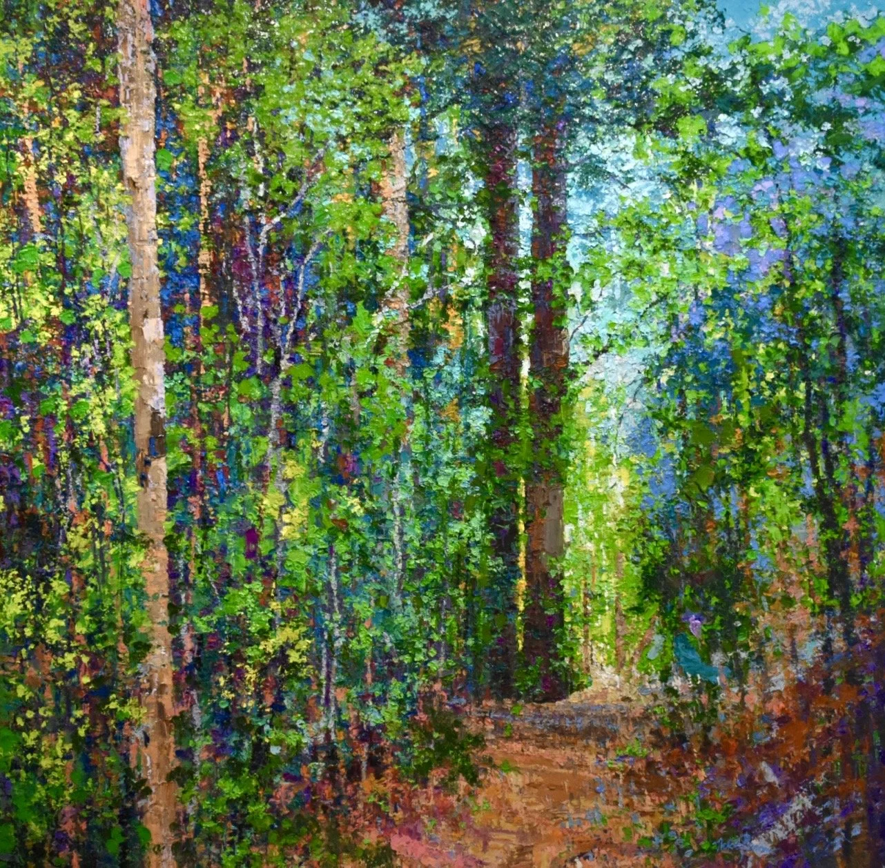 “Just Passing Through” 200cm x 200cm oil on canvas. Inspired by my own experience with peaceful moments spent walking within Celia Forest upon Table Mountain, Cape Town. As a creative, the most precious, enjoyable and profound part of the creative process is the opening up of my spirit and intuition to the mysterious, ancient Presence which pulsates consistently and eternally through all living things - both visible and invisible. As we find ourselves within modern society, of which concrete, digital and an array of man-made structures exits, via my impasto impressionist oil paintings I wish to offer viewers a mental and spiritual respite into those emotions of wellbeing and tranquility that we all experience when actually spending time in nature.